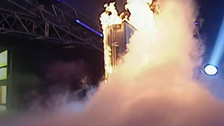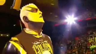 Bischoff senkt die Stimme und zeigt mit seiner rechten hand hoch zur Stage. Die Kamera schwenkt dort hin und wir sehn wie die ganze Stage schwarz wird. Nichts ist zu sehen, kein einziges Licht. Doch dann ertönt eine Theme welche die Halle zum Beben bringt. Eine Theme mit der sich die Stage in die Farbe Gold taucht.