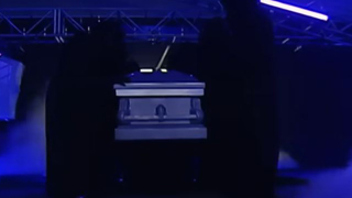 Langsam marschiert er die Rampe entlang , fokussiert auf den Ring. Vor diesem bleibt er einen Moment stehen, blickt zunächst Kyle O Reilly an, dann wendet er seinen Blick an Adam Cole. Dann dreht er sich zur Seite und schreitet die Ringtreppe nach oben. Dort hebt er die Hände und das Licht geht wieder an.